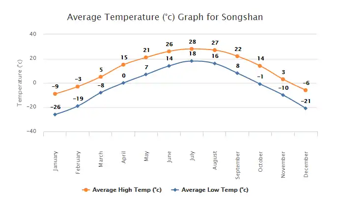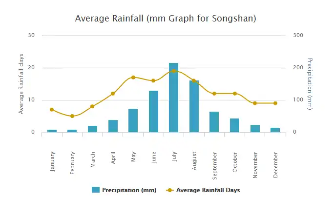 Here are graphs of the average monthly temperatures and the average monthly rainfall measurements in Songshan, Jilin. Both of the data sets taken for these graphs were taken in the years of 2000 to 2012.[5]