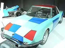 After the second world war, Sonia was a board member of the Salon des Réalités Nouvelles for several years.[40] Sonia and her son Charles in 1964 donated 114 works by Sonia and Robert to the Musée National d'Art Moderne.[41] Alberto Magnelli told her "she and Braque were the only living painters to have been shown at the Louvre".[42][43] In 1966 she published Rythmes-Couleurs (colour-rhythms), with 11 of her gouaches reproduced as pochoirs and texts by Jacques Damase,[44] and in 1969 Robes poèmes (poem-dresses), also with texts by Jacques Damase containing 27 pochoirs.[45] For Matra, she decorated a Matra 530. In 1975 Sonia was named an officer of the French Legion of Honor. From 1976 she developed a range of textiles, tableware and jewellery with French company Artcurial, inspired by her work from the 1920s.[46] Her autobiography, Nous irons jusqu'au soleil (We shall go up to the sun) was published in 1978.[47]