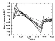 For today's supersonic aircraft in normal operating conditions, the peak overpressure varies from less than 50 to 500 Pa (1 to 10 psf (pound per square foot)) for an N-wave boom. Peak overpressures for U-waves are amplified two to five times the N-wave, but this amplified overpressure impacts only a very small area when compared to the area exposed to the rest of the sonic boom. The strongest sonic boom ever recorded was 7,000 Pa (144 psf) and it did not cause injury to the researchers who were exposed to it. The boom was produced by an F-4 flying just above the speed of sound at an altitude of 100 feet (30 m).[6] In recent tests, the maximum boom measured during more realistic flight conditions was 1,010 Pa (21 psf). There is a probability that some damage—shattered glass, for example—will result from a sonic boom. Buildings in good condition should suffer no damage by pressures of 530 Pa (11 psf) or less. And, typically, community exposure to sonic boom is below 100 Pa (2 psf). Ground motion resulting from sonic boom is rare and is well below structural damage thresholds accepted by the U.S. Bureau of Mines and other agencies.[7]
