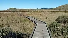 Although some parts of the park are too steep for easy access between Route 1 and the ocean, Kortum Trail is convenient for hiking between highway access points at Goat Rock, Shell Beach, and Wright's Beach.[3] Total trail length is approximately 3.8 mi (6.1 km).[4] The well-maintained trail includes wooden walkways across wetlands and bridges over streams.[5] Side trails offer access to the beach and to bouldering opportunities at Sunset Boulders. Trail users may observe whales offshore and wildflowers, birds, and deer within the coastal park.[6]