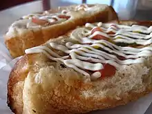 The Sonoran hot dog is a style of hot dog that originated in Hermosillo, the capital of the Mexican state of Sonora, in the late 1980s.[1][2] It is popular in Tucson,[3][4][5][6] Phoenix,[7] and elsewhere in southern Arizona.[8] It consists of a hot dog that is wrapped in bacon and grilled, served on a bolillo-style hot dog bun, and topped with pinto beans, onions, tomatoes, and a variety of additional condiments, often including mayonnaise, mustard, and jalapeño salsa.[9][10]