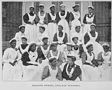 Sophia B. Jones became the first black faculty member at Spelman College when she was hired in 1885.[11] While at Spelman, she organized the school's nurses training program and led their infirmary.[12]
