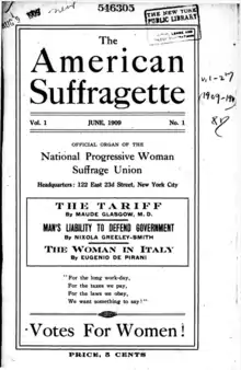 - "The American Suffragette: Official Organ of the National Progressive Woman Suffrage Union". The American Suffragette. 1 (1). June 1909 – via Nineteenth Century Collections Online.