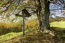 Sopotnica is the site of two known mass graves from the period immediately after the Second World War. The Muretovina 1 and 2 mass graves (Slovene: Grobišče Muretovina 1, 2) are located on the southern slope of Mure Hill (Muretov grič) north of the Poljane Sora River, in a meadow at the abandoned Mure[3]: 87 farm. The first grave contains the remains of seven Home Guard soldiers that were murdered after the war and buried in a firing trench at the former Home Guard post at the site.[4] The second grave contains the remains of up to 17 Home Guard soldiers that were murdered after the war and thrown into an abandoned well. The remains were completely or mostly removed from the well in 1957.[5]