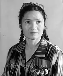 She left Uzbekistan in 1924 as part of a group of 24 Uzbek theater students chosen to study in Moscow.[6] The students would later form the Hamza Drama Theater.[7] The group returned to Uzbekistan in 1927, where they were in danger of being attacked by religious fanatics for their encouragement of unveiling. Several of Eshontoʻrayeva's colleagues were murdered by religious fanatics, including Tursunoy Saidazimova who was killed when the group was on tour in Bukhara in 1928,[8] followed by the murder of Hamza in Shohimardon in 1929.[9][10]