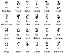 The Sora language has multiple writing systems.[9] One is called Sora Sompeng, a native writing system created only for the Sora language. It was developed in 1936 by Mangei Gomango.