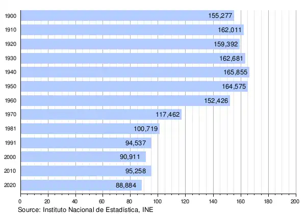 Of the province's population of 91,487 (2002), nearly 40% live in the capital, Soria. 26.7% of its population was above 65 years of age while the nation's average is 16.9%.[2] There are 183 municipalities in Soria, of which nearly half are hamlets of under 100 people[2] and of which only 12 have more than 1000 people. The cathedral town of the province is El Burgo de Osma.