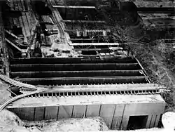 The L-shaped main building enclosed a large concrete pad, forming a 180 m long by 57 m wide rectangle with 4.50 m-thick walls.[12] Two other smaller bunkers were built on the site but no installations to produce liquid oxygen.