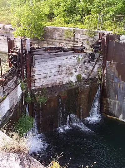 The Soulanges Canal is an abandoned shipping canal in Quebec, Canada. It follows the north shore of the Saint Lawrence River between Pointe-des-Cascades and Coteaux-Landing, bypassing the rapids between Lake Saint-Louis and Lake Saint-Francis. In between, it passes through the towns of Les Cèdres and Coteau-du-Lac. It superseded the first Beauharnois Canal which was on the south shore of the Saint Lawrence. It is 23 kilometres (14 mi) long and had a 4.3-metre (14.1 ft) draught. Five locks measuring 85.3 m × 14 m (279.9 ft × 45.9 ft) give a total rise of 25 metres (82 ft).[1]