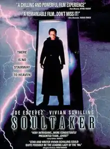 Soultaker is a 1990 American fantasy horror film written by Vivian Schilling and directed by Michael Rissi.[3] It stars Joe Estevez in the title role, alongside Vivian Schilling, Gregg Thomsen, Chuck Williams, Robert Z'Dar, and David "Shark" Fralick. The film follows a group of young adults who try to flee from the titular "Soultaker" when their souls are ejected from their bodies after a car accident. Inspired by discussions with Action International Pictures producer Eric Parkinson, the script was based on a real-life car accident which Schilling was involved in.