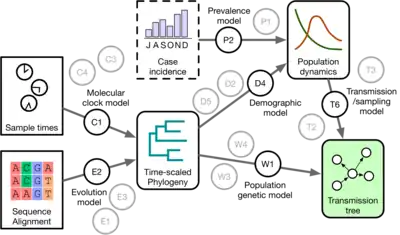 {{cite journal}}: CS1 maint: multiple names: authors list (link) - Didelot X, Gardy J, Colijn C (2014). "Bayesian inference of infectious disease transmission from whole-genome sequence data". Mol Biol Evol. 31 (7): 1869–79. doi:10.1093/molbev/msu121. PMC 4069612. PMID 24714079.