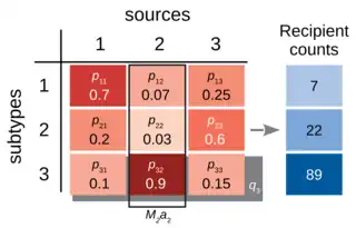 where is the proportion of (non-human) cases in the -th source population associated with subtype , and is the number of cases of subtype in the recipient (human) population. For instance, if the frequencies of subtype X among three potential sources was 0.8, 0.5 and 0.1, respectively, then the expected number of cases (out of a total of 100) from the second source is . This simple formula is a maximum likelihood estimator when the total force of infection from each source into the human population is uniform, e.g., the sources have equal population sizes.