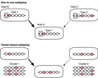 Today it is more common to use genetic sequencing to characterize the microbial sample at the level of its nucleotide sequence by sequencing the whole genome or proportions thereof.[3] However, other molecular methods such as restriction length fragment polymorphism [1] have historically played an important role in microbial subtyping before genetic sequencing became an affordable and ubiquitous technology in reference laboratories. Sequence-based typing methods confer an advantage over other laboratory methods (such as serotyping or pulsed-field gel electrophoresis [4]) because there is an enormous number of potential subtypes that can be resolved at the level of the genetic sequence. Consider the above example again; however, this time host A carries the same infection subtype as many other hosts. In this case we would have no information to differentiate between these hosts as the potential source of host A's infection. Our ability to identify potential sources, therefore, depends on having a sufficient number of different subtypes. However, defining too many subtypes in the population makes it likely that every individual carries a unique subtype, especially for rapidly-evolving pathogens that can accumulate high levels of genetic diversity in a relatively short period of time. Hence, there exists an intermediate level of subtype resolution that confers the greatest amount of information for source attribution.[5] When source attribution is considered for a pathogen with high diversity, such that most specimens have unique genetic sequences, it is useful to group multiple unique sequences with a clustering method.