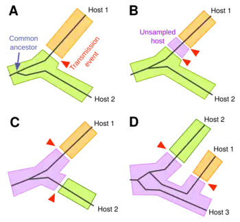 As noted above, the diversification of pathogen populations within each host results in a discordance between the shapes of the pathogen phylogeny and the transmission tree. Phylodynamic methods that treat the phylogeny as equivalent to the transmission tree assume implicitly that the population within each host is small enough to be approximated by a single lineage.[53][49][63] If the within-host population is diverse, then a transmission event will tend to underestimate the time since two lineages split from their common ancestor (Figure 3A); this phenomenon is analogous to the incomplete lineage sorting affecting gene trees relative to the species tree.[64] The resulting discordance between the phylogenetic and transmission trees makes it more difficult to reconstruct the latter from the observed data. Moreover, the effect of within-host diversity becomes even greater if there are incomplete transmission bottlenecks — where a new infection is established by more than one lineage transmitted from the source population — because the common ancestor of pathogen lineages may be located in previous hosts further back in time.[59]