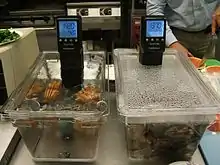 Sous vide has become common on cooking TV shows such as Iron Chef America and Top Chef, and in restaurants such as Panera Bread.[20] It has also been used to quickly produce significant quantities of meals for hurricane evacuees.[21] Nonprofessional cooks are also beginning to use sous vide cooking.[22]