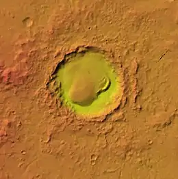 Very close to the crater there are what have been named "Swiss cheese" features. Swiss cheese features (SCFs) are pits so named because they look like the holes in Swiss cheese. They were first seen in 2000 using Mars Orbiter Camera imagery.[2] They are usually a few hundred meters across and 8 metres (26 ft) deep, with a flat base and steep sides. They tend to have similar bean-like shapes with a cusp pointing towards the south pole. The angle of the sun probably contributes to their roundness. Near the Martian summer solstice, the sun can remain continuously just above the horizon; as a result the walls of a round depression will receive more intense sunlight, and sublimate much more rapidly than the floor. The walls sublimate and recede, while the floor remains the same.[3][4]
