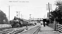 South Acton served as a station stop for both the Fitchburg Branch and Marlborough Branch of the B&M. The Marlborough Branch split off from the Fitchburg Railroad west of the station. The station also maintained a two-stall round house, a freight house, and a turntable, located off the Marlborough Branch. Marlborough Branch passenger service ended in 1939, though freight service continued on the line until around 1970. The stub of the branch at South Acton was used as a siding to turn RDC trains until its abandonment in 1979.[8] The right-of-way has since been reused for the Assabet River Rail Trail on its Hudson and Marlborough section. In 2018 rail trail construction will be completed on a 3.4 mile section starting at train station and extending southeast through Maynard to the Maynard/Stow border.