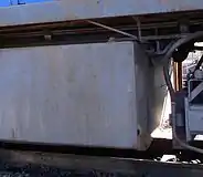 To be usable on the iron ore line, Class 34-400 units which ended up working there were modified to a similar fuel capacity. The inter-bogie linkage was removed and the fuel tank was enlarged by changing it from saddle-shaped to rectangular box-shaped. To maintain its lateral balance, a slab of metal was attached to each bogie in place of the removed linkage. In the second picture, the weld lines on the end of the enlarged fuel tank as well as the metal slab at the end of the bogie are visible.