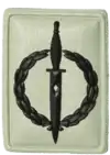 All members who complete all the required qualifications to become a Special Forces Operator, are awarded an "Operator's Badge".[23] Each badge is numbered and a register of the numbers and who they have been awarded to is kept.[24][25] The badge consists of an inverted Commando Knife within a laurel wreath, which is meant to symbolise both special forces (the knife) and victory (the wreath).[23]