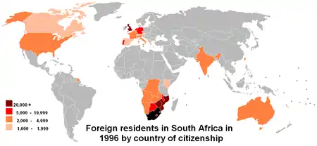 In 2011, Statistics South Africa counted 2.1 million foreigners in total.[5] Reports suggest that is an underestimation. The real figure may be as high as five million,[6] including some three million Zimbabweans.[7]
