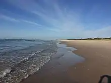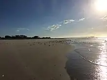 South Ballina Beach looking north, April 2019. The Southern Breakwall of the Richmond River can be seen in the distance.