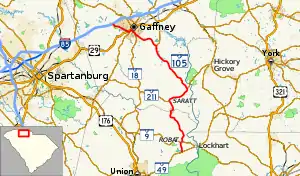 SC 105 begins at an intersection with SC 49 (Lockhart Highway) south of Robat, in rural parts of northeastern Union County. It travels to the north and almost immediately intersects SC 9 (Jonesville–Lockhart Highway). The highway gradually moves to a more westerly routing, while still traveling north. It crosses over the Pacolet River on an unnamed bridge, where it enters Cherokee County. In Saratt, it intersects SC 211 (Gowdeysville Road). The two highways travel concurrently to the east-northeast. They split in a rural area, with SC 105 traveling to the north-northwest. It goes through Wilkinsville and intersects SC 329 (Victory Trail Road). In the southern part of Gaffney, the highway begins a concurrency with SC 18 (Frederick Street) near Limestone College. The concurrency only lasts about 1,000 feet (300 m). It turns left onto Union Street, and follows that road until it meets College Drive. Then, it turns right, before turning left onto East Rutledge Avenue. It then turns left onto SC 150 (South Limestone Street). The two highways split when SC 105 turns right onto Corry Street. It then intersects U.S. Route 29 (US 29; Old Georgia Highway/South Granard Street). After a temporary departure from the city limits, where the highway passes a Freightliner plant, it meets its northern terminus, an interchange with Interstate 85. Here, the roadway continues as Hyatt Street.[3][4]