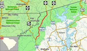 South Carolina Highway 107 (SC 107) is a 15.290-mile (24.607 km) state highway in the western part of the U.S. state of South Carolina. It connects Oconee County with Jackson County, North Carolina and the Cashiers area. Nearly the entirety of the route is located in the Sumter National Forest.