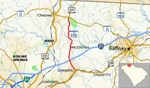 South Carolina Highway 110 (SC 110) is a state highway in the U.S. state of South Carolina that travels 9.280 miles (14.935 km) from US 29 in Cowpens to US 221 Alt and SC 11 at Cowpens National Battlefield near Chesnee.[3] It is signed[3] and internally designated as an east–west highway though it runs north–south physically.