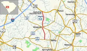 South Carolina Highway 113 (SC 113) is a 13.610-mile-long (21.903 km) state highway in the U.S. state of South Carolina. The highway connects rural areas of Aiken and Lexington counties with Wagener.