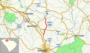 South Carolina Highway 114 (SC 114) is a 6.360-mile-long (10.235 km) state highway in the U.S. state of South Carolina. The highway travels through rural areas of Union County. The highway has both termini at SC 18 and passes to the east of Jonesville. It is officially designated as a west–east highway, but is physically north–south.
