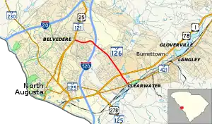 SC 126 is a suburban highway that travels 4.2 miles (6.8 km) from U.S. Route 25 (US 25)/SC 121 in Belvedere to SC 421 in Clearwater. In both Belvedere and North Augusta, SC 126 is a four-lane road with median; in Clearwater it only has two lanes. The entire highway has few commercial entities, mainly functioning to connect neighborhoods in the area. It also has intermediate junctions with Interstate 520 (I-520) and US 1/US 78.[2]