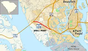 South Carolina Highway 128 (SC 128), is a 2.110-mile (3.396 km) state highway located entirely within Beaufort County, South Carolina. Also known locally as Savannah Highway, SC 128 serves as a principal arterial for the unincorporated Shell Point as well as providing a southern route serving Port Royal, Marine Corps Recruit Depot Parris Island, and the Sea Islands east of Beaufort.
