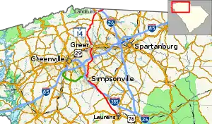 South Carolina Highway 14 (SC 14) is a state highway in the U.S. state of South Carolina. The state highway runs 59.24 miles (95.34 km) from U.S. Route 76 Business (US 76 Bus.) in Laurens north to Interstate 26 (I-26) in Landrum. SC 14 connects Laurens and Landrum with Greer, the city between Greenville and Spartanburg where the highway crosses I-85 and US 29. The highway also parallels I-385 through Fountain Inn and Simpsonville, South Carolina in southeastern Greenville County. SC 14 is a part of the National Highway System between I-85 and US 29 in Greer.[4]
