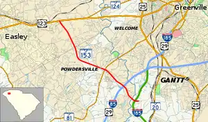South Carolina Highway 153 (SC 153) is a 11.510-mile (18.524 km) state highway, providing a major connection between U.S. Route 123 (US 123) and Interstate 85 (I-85), and also serving as a primary commercial corridor for the suburban Greenville community of Powdersville.