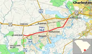 South Carolina Highway 162 (SC 162) is a 13.540-mile (21.791 km) state highway in the U.S. state of South Carolina. The highway connects Adams Run and Rantowles, via Hollywood.