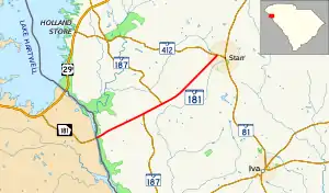 South Carolina Highway 181 (SC 181) is a 6.430-mile-long (10.348 km) state highway in the U.S. state of South Carolina. The highway connects the Georgia state line with Starr.