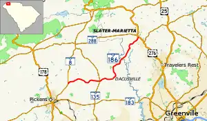 South Carolina Highway 186 (SC 186) is a 14.960-mile-long (24.076 km) state highway in the U.S. state of South Carolina. The highway connects rural areas of Pickens County with Slater-Marietta in Greenville County.