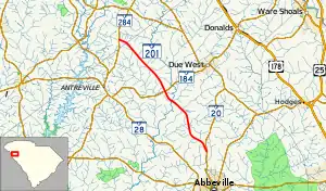 South Carolina Highway 201 (SC 201) is a 12.550-mile-long (20.197 km) state highway in the U.S. state of South Carolina. The highway travels through rural areas of Abbeville and Anderson counties, and does not travel through any cities or towns. Virtually all of the highway is in Abbeville County with only a small portion, 3⁄4 mile (1.2 km) of the highway's total length, at the northern end in Anderson County.