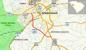SC 225 begins at the U.S. Route 25 (US 25)/US 178 concurrency southeast of Greenwood. The highway swings around to the west side of the city where it ends at SC 72 Business (SC 72 Bus.).[2]