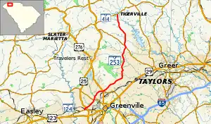 The highway begins at SC 124 near Parker and travels 1⁄2 mi (0.80 km) northeast to SC 183 as West Blue Ridge Drive. It then moves up to Sulphur Springs Road where the road changes to East Blue Ridge Drive before intersecting at Poinsett Highway on U.S. Highway 276 (US 276) before running concurrently on SC 291 as North Pleasantburg Drive for 0.16 mi (0.26 km) before turning left at Paris Mountain Road. After traveling 2.53 mi (4.07 km) and passing Greenvista Drive, SC 253 becomes East Mountain Creek Road and traveling and additional 6.71 mi (10.80 km) before intersecting with SC 290. SC 253 then turns left and goes 7.22 mi (11.62 km) before terminating at SC 414 in Tigerville.[2][3]
