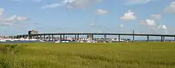 The bridge across the Ashley River is named the Robert B. Scarborough Bridge, named for a former state legislator and highway commissioner. The bridge is 2.9 miles (4.7 km) long and cost $124.7 million to build.[3] The bridge also crosses Wappoo Creek, which is a part of the Intracoastal Waterway.