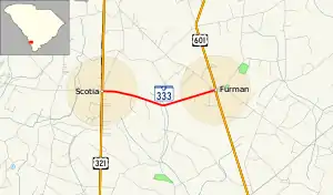 South Carolina Highway 333 (SC 333) is a 3.340-mile (5.375 km) primary state highway in the U.S. state of South Carolina. It serves as a connector highway between the towns of Scotia and Furman.
