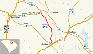 South Carolina Highway 346 (SC 346) is a 12.580-mile (20.246 km) state highway in Kershaw County, in the northern part of the U.S. state of South Carolina. It is a north–south highway traveling between Bethune at SC 341 and SC 903 about two miles (3.2 km) west of Catarrh. Except within Bethune, it travels through rural wooded areas of the Sandhills region of the state.