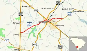 South Carolina Highway 363 (SC 363) is a 13.270-mile-long (21.356 km) state highway in the U.S. state of South Carolina. The highway is designated on an east–west direction, from U.S. Route 321 (US 321) in Luray to SC 63 just outside Varnville.