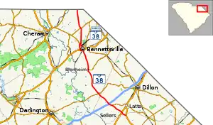 South Carolina Highway 38 Business (SC 38 Bus.) is a 2.865-mile (4.611 km) business route of SC 38 in Bennettsville. It begins at the intersection with U.S. Route 15 (US 15), US 401, SC 9, and SC 38 south of town. The route begins running concurrent with SC 9 heading north along Broad Street. In front of the Marlboro County Courthouse, both SC 9 and SC 38 Bus. make a left along Main Street until reaching the southern terminus of Cheraw Street. Where Cheraw Street and Hamlet Highway merge, both SC 9 and SC 38 Bus. separate. SC 38 Bus. continues on Hamlet Highway heading north. The business route then reaches its northern terminus at a roundabout with its parent route SC 38.[10]