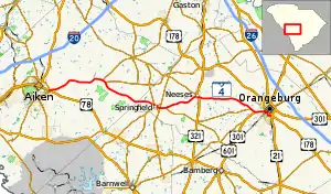 South Carolina Highway 4 (SC 4) is a primary 54.430-mile-long (87.597 km) state highway in the southern part of the U.S. state of South Carolina. The highway connects Aiken and Orangeburg, via Springfield and Neeses.