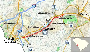 SC 421 begins where it splits off from US 1/US 78 (Jefferson Davis Highway) southwest of Clearwater; it immediately connects with US 278/SC 125 (Atomic Road). Heading northeast, it parallels US 1/US 78 to its south, going through the towns of Clearwater, Burnettown, Langley, Gloverville and Warrenville. Upon entering Aiken, it reconnects with US 1/US 78. A majority of the highway is four-lanes that travels a total of 10.4 miles (16.7 km).[2]