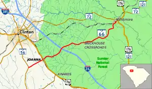 SC 66 is a two-lane rural highway that travels 17.6 miles (28.3 km) from SC 56 to SC 72 in Whitmire. It connects to U.S. Route 76 (US 76) and Interstate 26 (I-26). Predominantly in the Sumter National Forest, it meanders through forest lands; in Whitmire, it takes a couple of turns before reaching SC 72 via Central Avenue, Park Street and Glenn Street.[3]