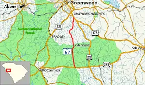 South Carolina Highway 67 (SC 67) is a 15.460-mile-long (24.880 km) state highway in the U.S. state of South Carolina. The highway travels through rural areas of Edgefield, McCormick, and Greenwood counties, as well as part of Sumter National Forest.