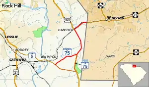 South Carolina Highway 75 Truck (SC 75 Truck) is a 4.6-mile-long (7.4 km) truck route of SC 75 bypassing Van Wyck. It begins at SC 75's southern terminus at SC 5. It follows SC 5 until it has an interchange with U.S. Route 521 (US 521). It then follows US 521 until they meet SC 75.[5]